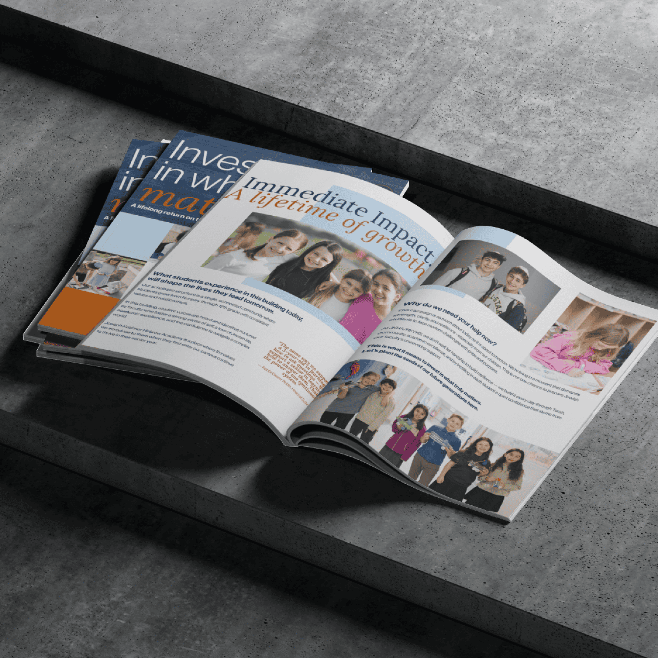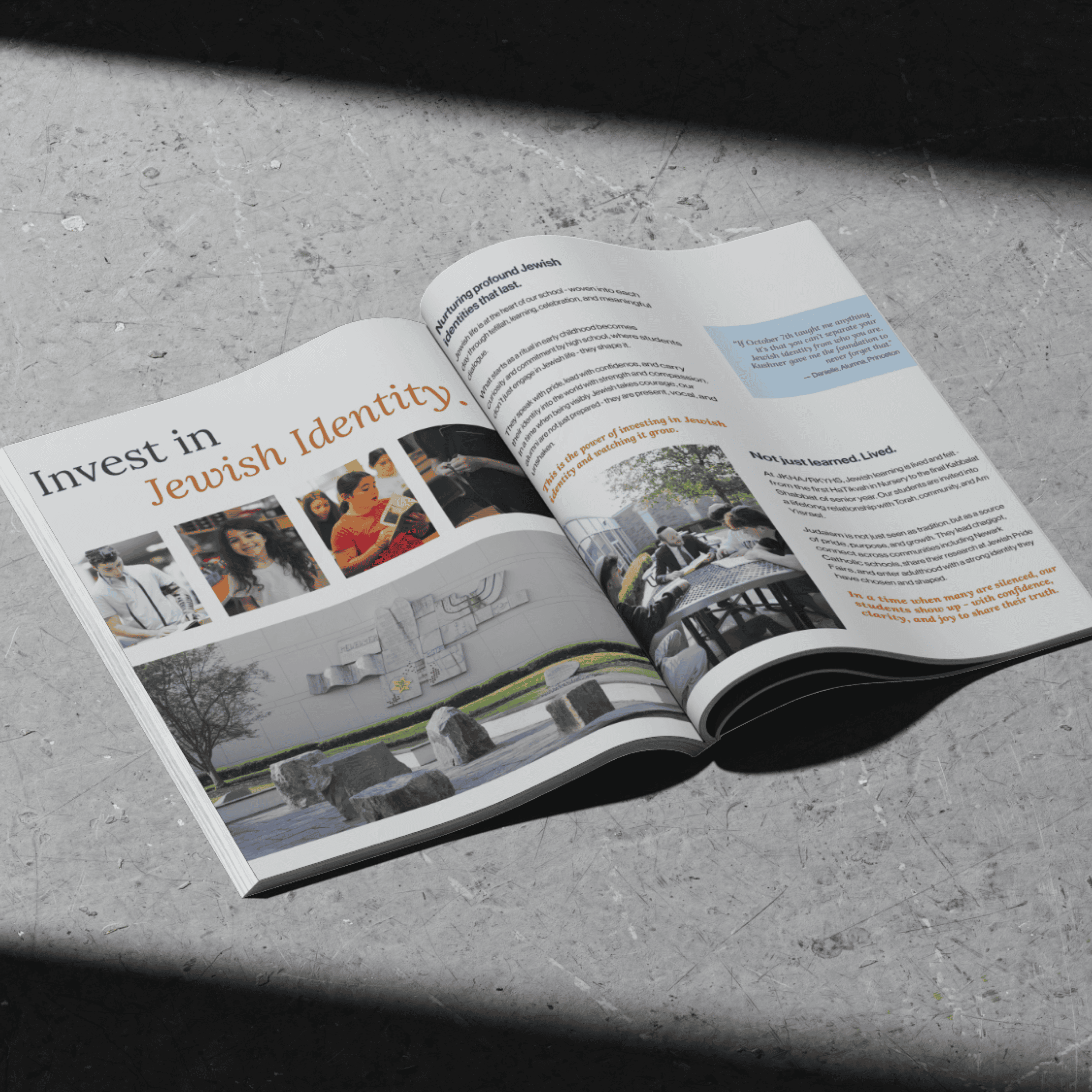 The brochure had to communicate the full breadth of the school -- Torah, Israel advocacy, STEM, the arts, financial accessibility -- without feeling like a laundry list.