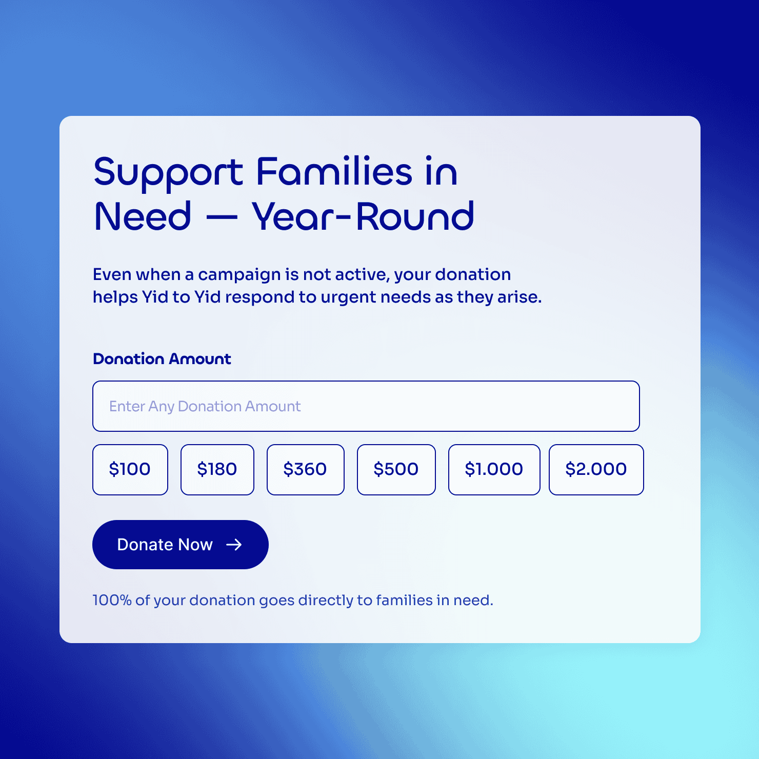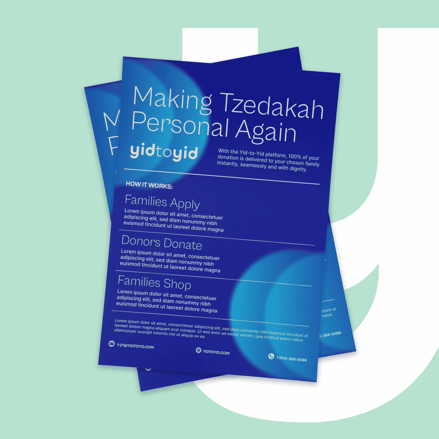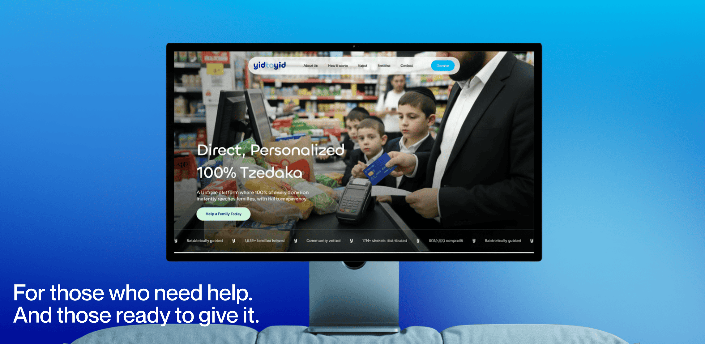 Yid to Yid sits in a crowded nonprofit-tech space, but it operates from a different philosophy: no institutional middlemen, no generic donation pages. The brand, the messaging, and the site all had to communicate that distinction immediately -- warm enough to earn trust, credible enough to handle real fundraising.